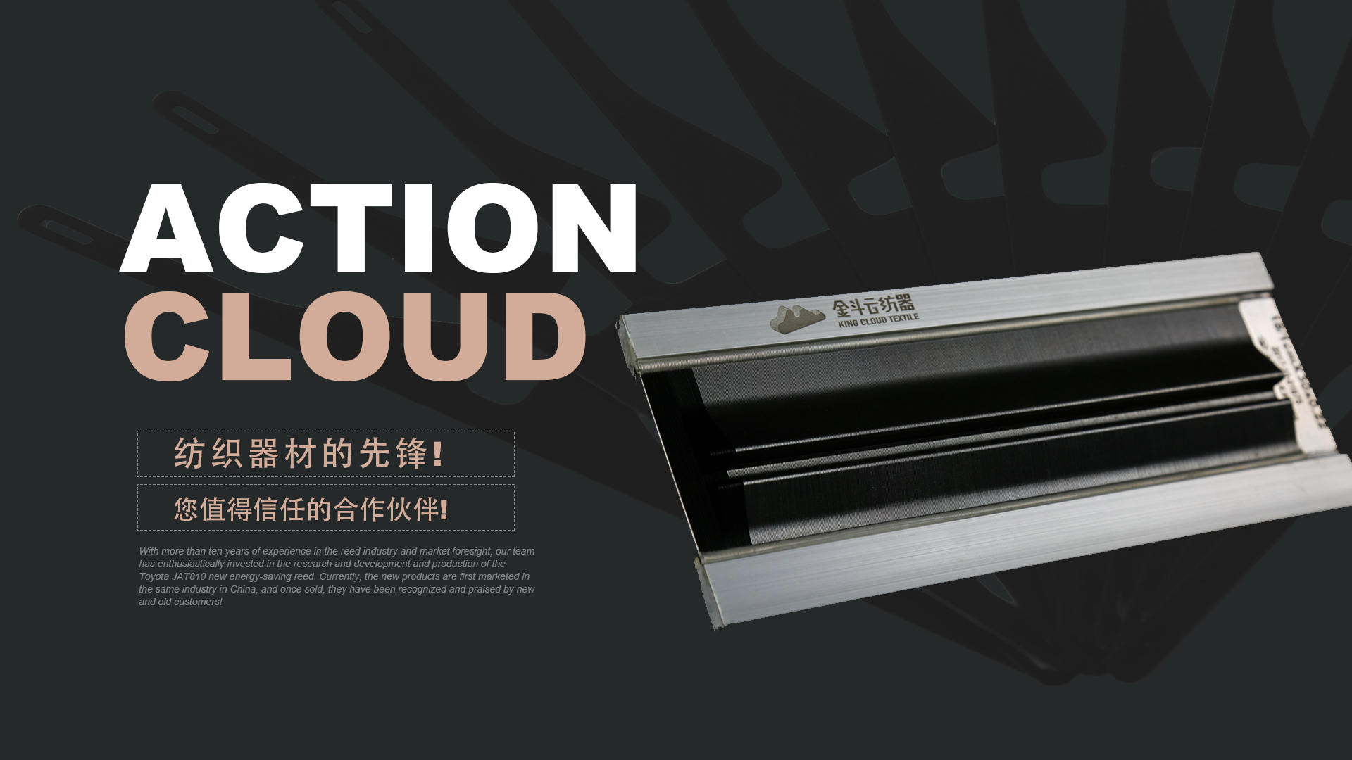 憑借十多年鋼筘行業(yè)經(jīng)驗及對市場的前瞻性,我們團(tuán)隊滿懷熱情的投入到豐田JAT810新型節(jié)能鋼筘的研發(fā)和生產(chǎn)當(dāng)中,目前新產(chǎn)品在國內(nèi)同行業(yè)中先行上市銷售,一經(jīng)銷售就得到了新老客戶的認(rèn)可和好評!